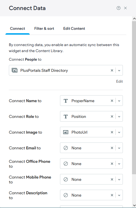 Widgets may be connected to collections to dynamically display back the content from those tables. Multiple widgets may be connected to a single collection, even a Dynamic Page template can be connected to a collection, making collections very powerful tools. For example, connecting multiple Photo Gallery widgets to a staff directory collection, and then using a category field (column) to filter and display staff by a department. Also see this article about Connected Widgets.