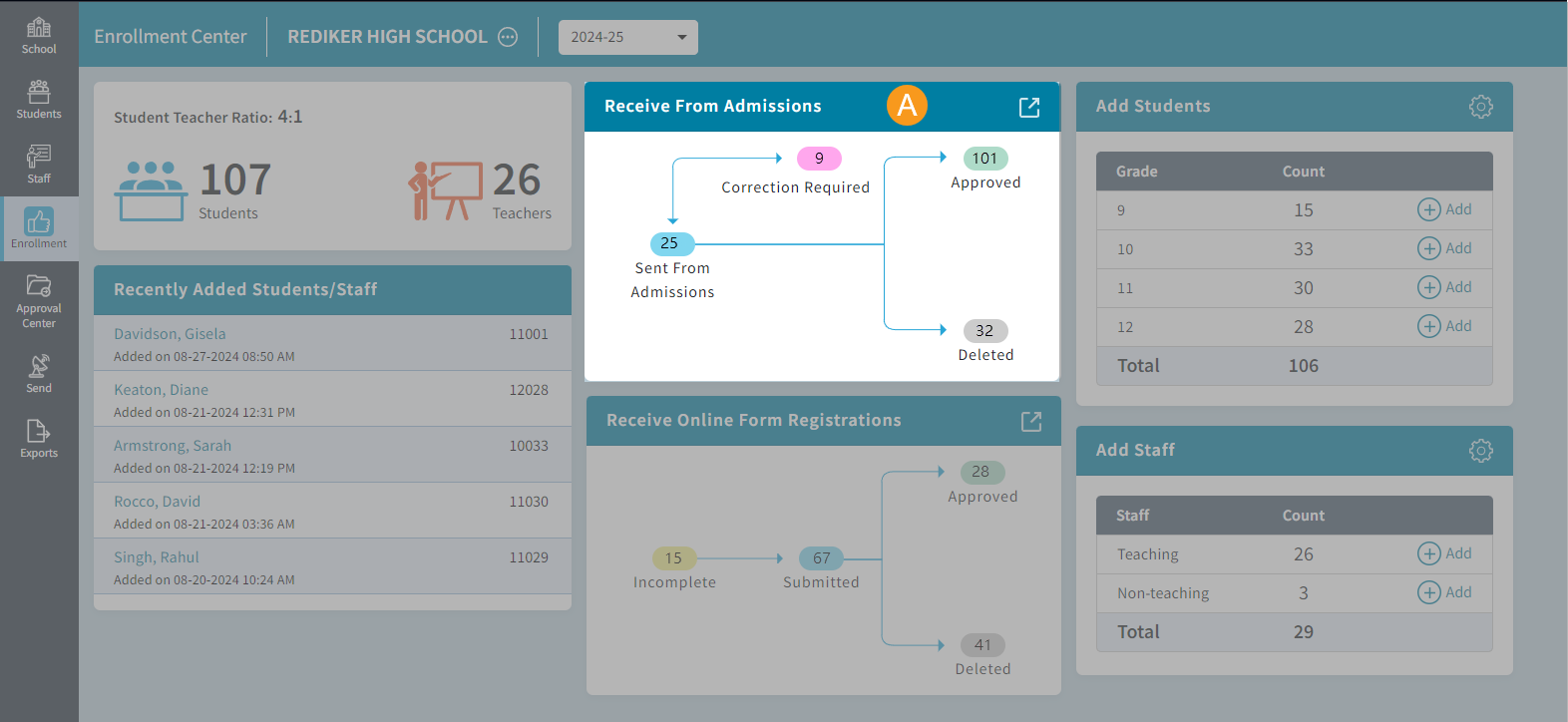 A | Receive From Admissions: Prospects sent from Admissions can be reviewed in the Enrollment Center. In the Receive from Admissions widget, the number of Students Sent from Admissions, Corrections Required, Approved, and Deleted forms are displayed. Select |