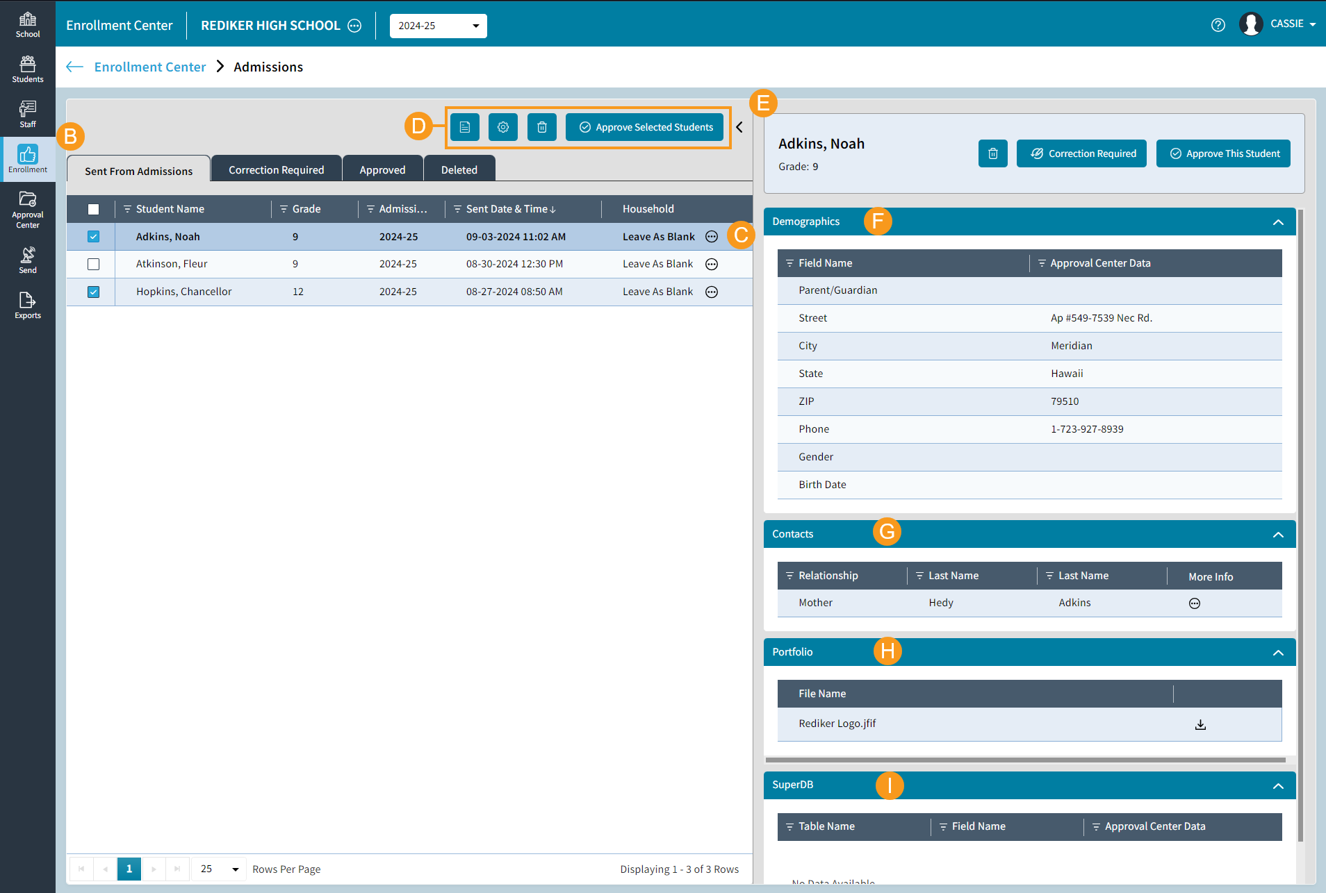 C | Along the top you can View the log, change the Settings, Delete Students sent from Admissions, or Approve Selected Students.