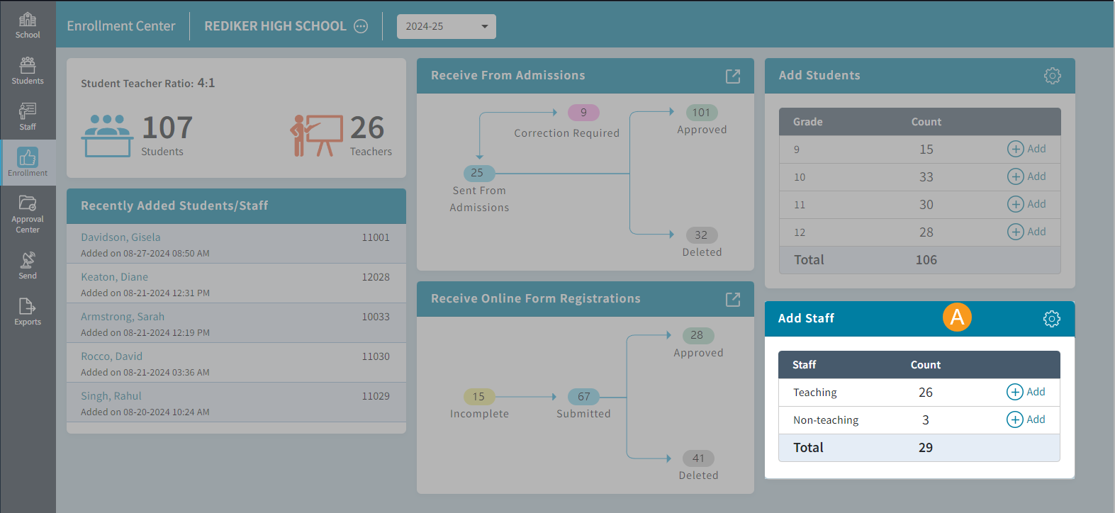 A | Add Staff widget: Teaching and Non-Teaching staff type are displayed, along with the totals of each type. Select the gear icon to open the Add Student settings, where you can Select demographic fields for the Enter Demographics section. You may select up to 20 demographic fields. You may also select the following default settings: