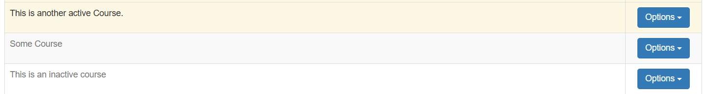 Courses that are active will appear with a yellow background. Inactivated courses appear with a white background. Inactive courses will not be available to select when starting an evaluation.