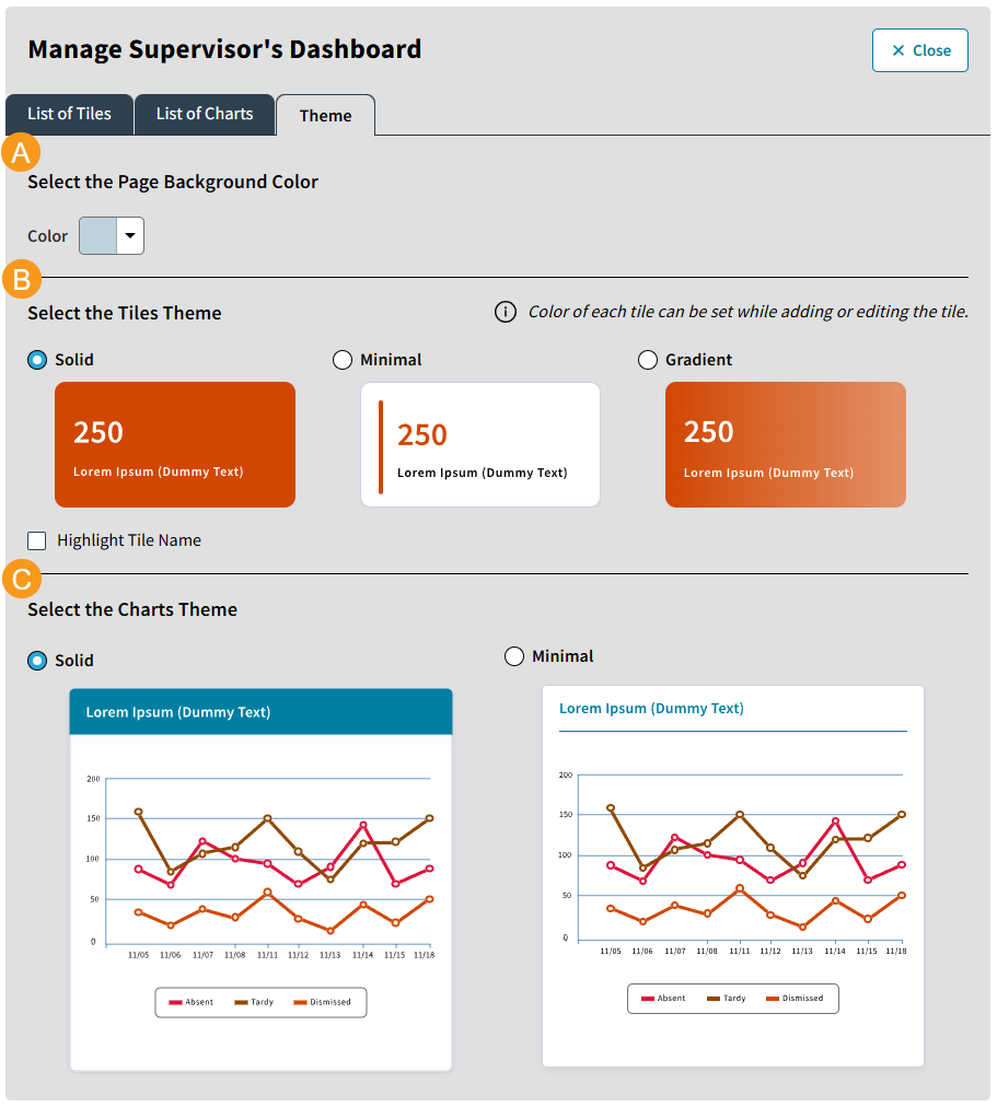 Customize your Dashboard Theme to match your preferences! Select a background color, choose between Tile Themes (Solid, Minimal, or Gradient), and pick a Chart Theme (Solid or Minimal). You also have the flexibility to highlight the title names on Tiles and enable axes titles and data labels on Charts for clearer visualization.