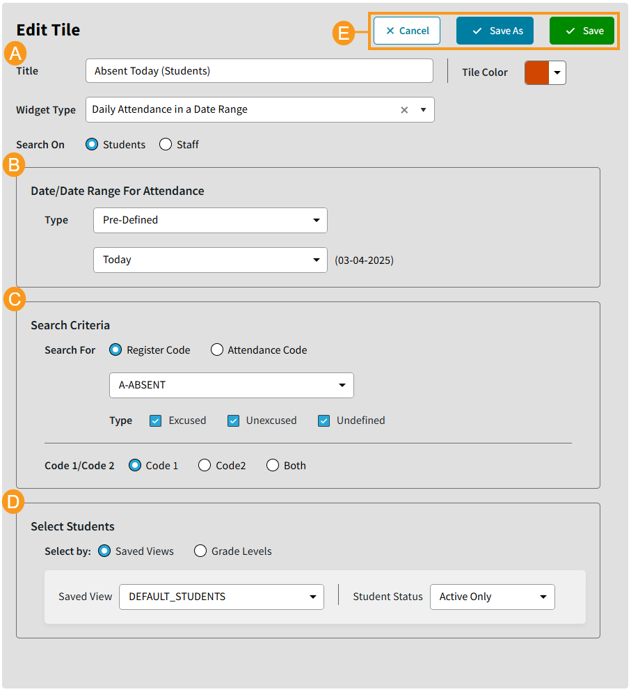 When editing a Tile, the available options will vary based on the Widget Type selected for that specific Tile. Some Widget Types may have less settings selections. In the example below, Daily Attendance in a Date Range is selected. Click edit
