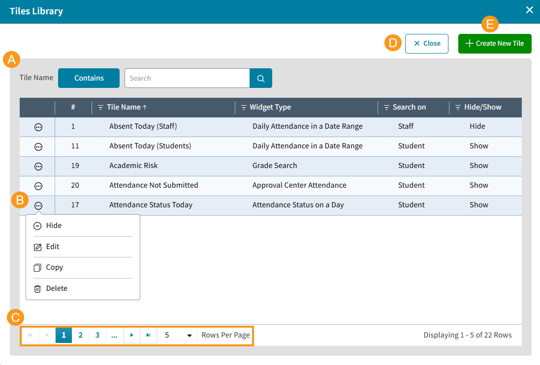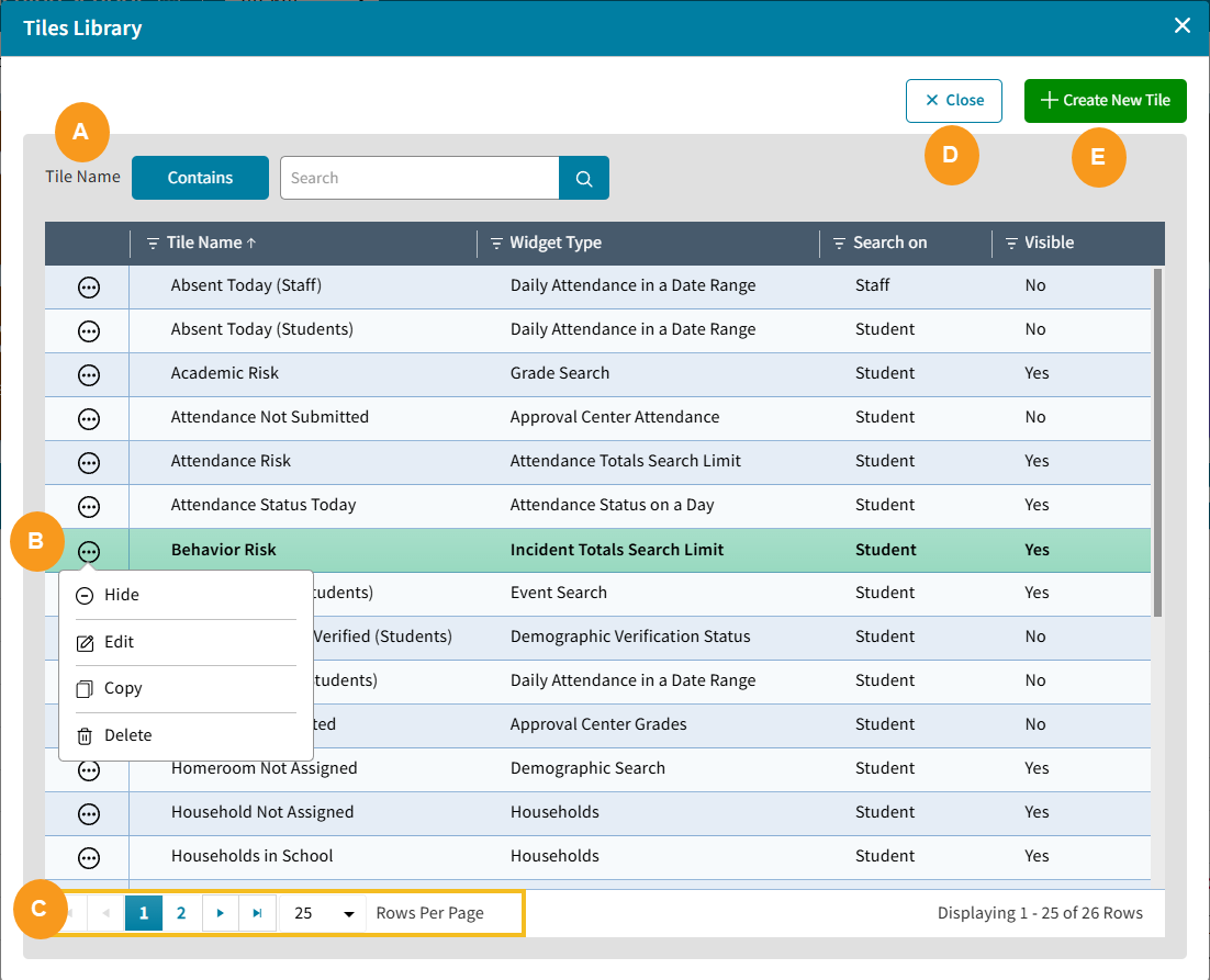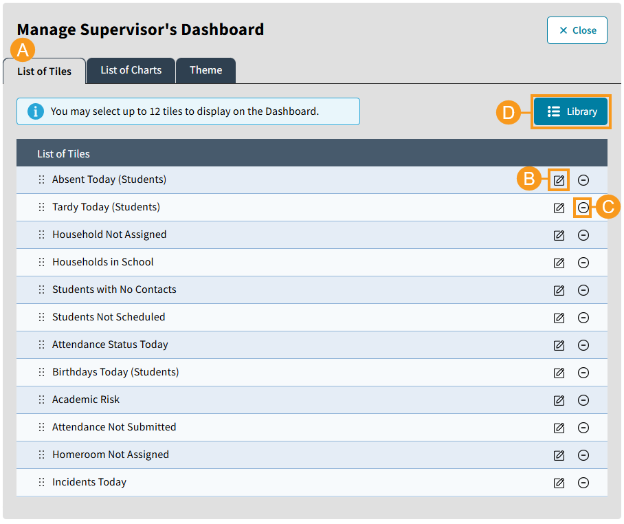 The library contains all the predefined Tiles. Select Library to view all Tiles. See the diagram and table below for more information.
