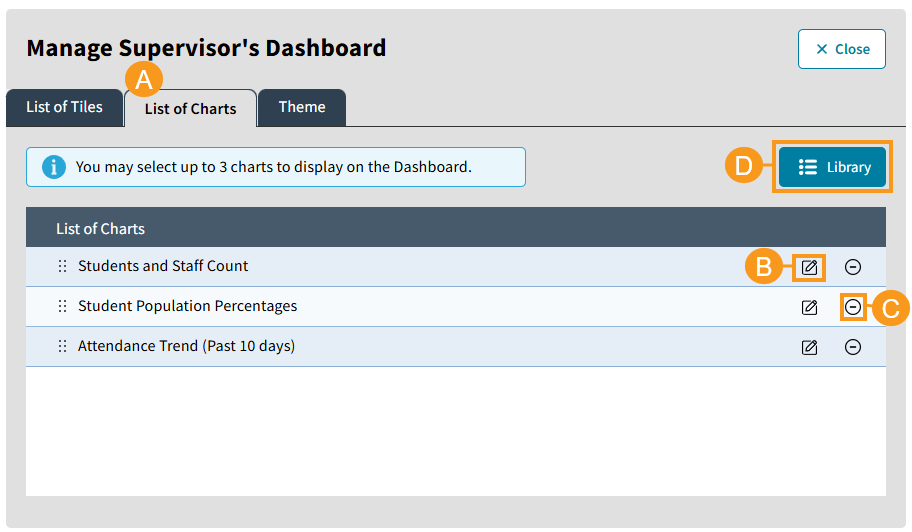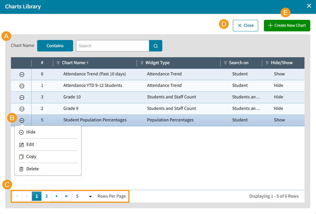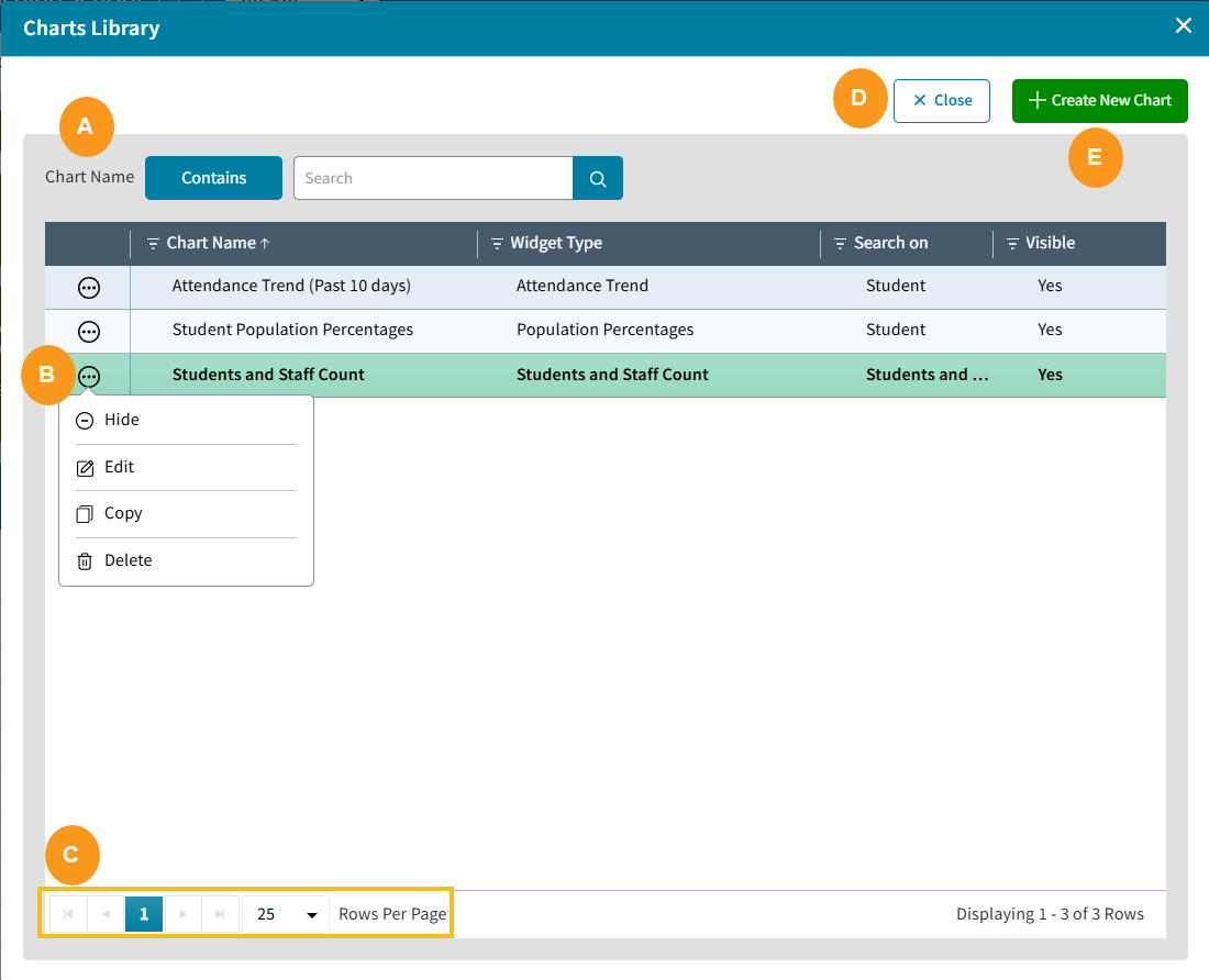 The List of Charts displayed on your Dashboard are fully customizable. You can edit their order, title, display options, and content to fit your needs. For example, instead of viewing statistics for the entire school, you can filter data by View or Grade Level to focus on specific student groups. The Library currently offers 3 default charts, but you can create and save new charts based on the existing chart types. Stay tuned for future releases, where additional widget types for charts will be introduced to expand your options further.