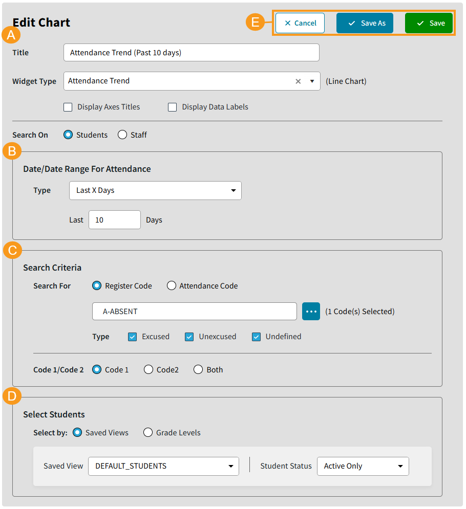 When editing a Chart, the available options will vary based on the Widget Type selected for that specific Chart. Some Widget Types may have less settings selections. In the example below, Attendance Trend is selected. Click edit