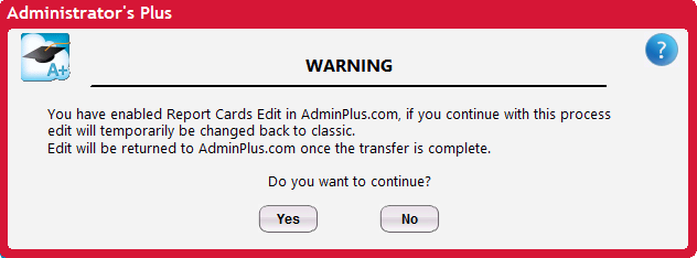 If a school edits Report Cards in AdminPlus.com, the RC Transfer Process will do the following: receive the updates from AdminPlus.com > switch the edit setting back to classic > complete the transfer > send the changes to AdminPlus.com > restore the edit settings to AdminPlus.com.