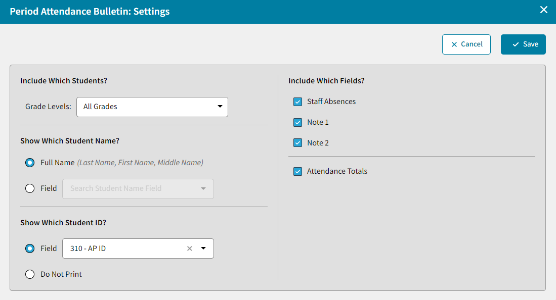 - Show Which Student ID? Select a Field such as APID or select Do Not Print.