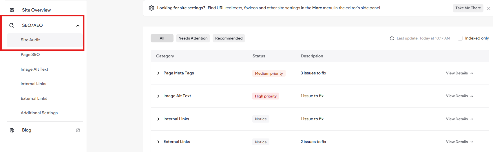 - Site Audit (SEO Overview)- On the Dashboard click SEO/AEO. View a summary of your site's SEO and fix issues to improve its ranking in traditional and AI search results. This tool lets you review and fix potential issues. It will flag and recommend items for review. The tool can also help not only update page meta data but can offer suggestions.