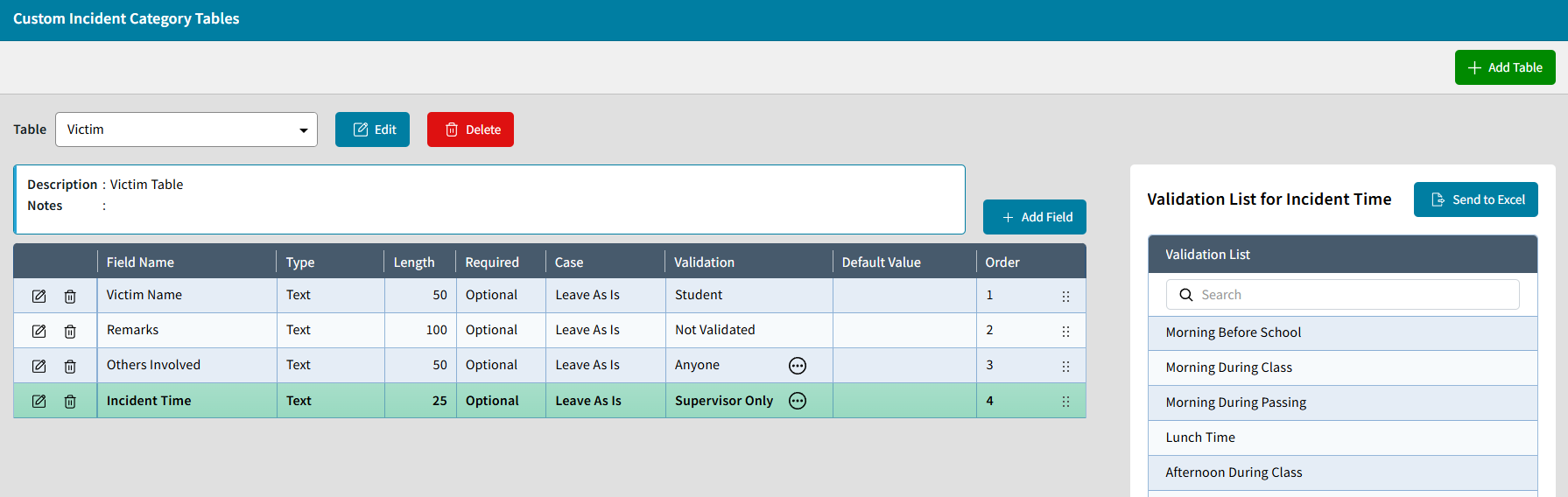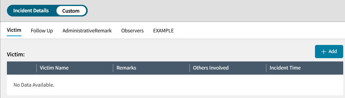 These tables are custom fields that can be used to add additional information to an Incident. For example, Victim Name allows another student's name to be selected and added on to an incident, which is helpful when documenting potential targeting in a suspected bullying situation. A school with special policies may find these custom tables extraordinarily helpful. This feature can also be used to add additional remarks that are more private than the default Comment field on an incident.