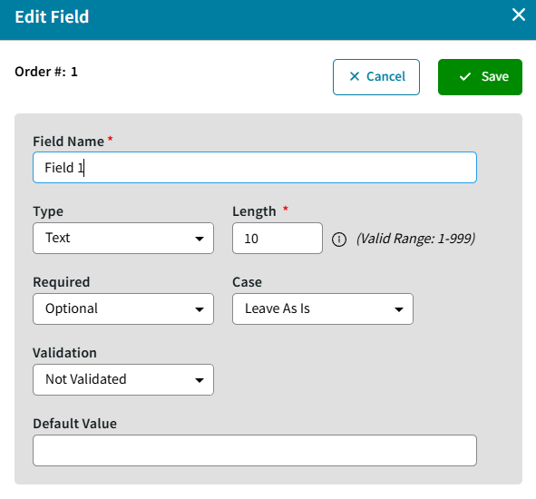 - Click the edit icon for Field 1 and update the Field Name and other field properties are needed. See notes below for more details