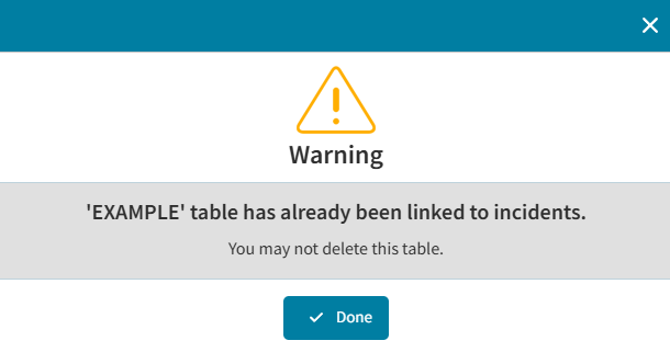 You cannot delete a table that has already been used and linked to any incidents. Meaning if an incident was created and the custom table was used to input data for that incident, then the table cannot be deleted. This is done in order to protect your data. A popup warning will indicate as such.