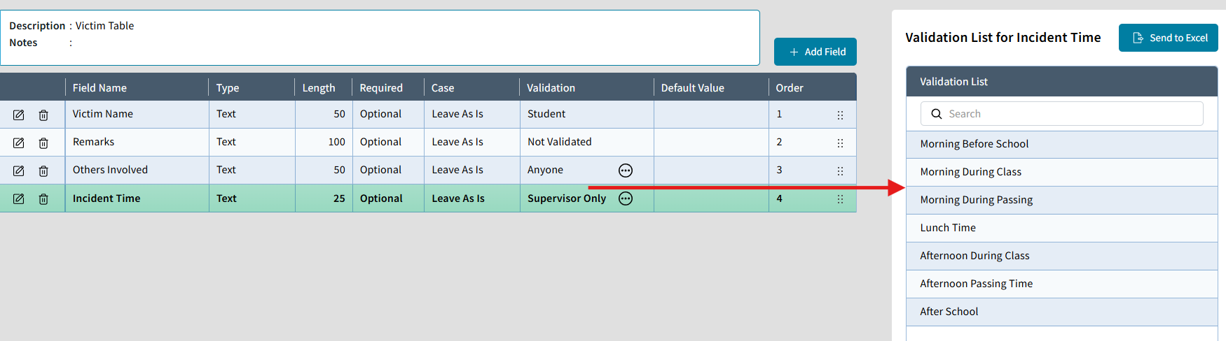 - Select a Field row to view the Validation List on the right panel.