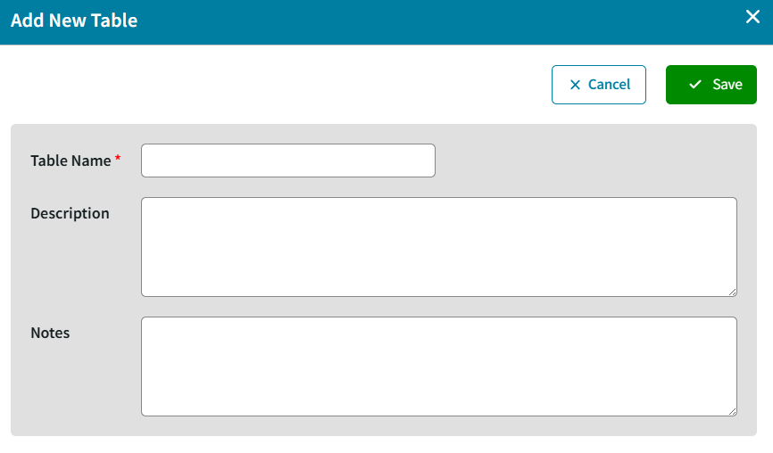 - You will be first prompted to input a required Table Name (20-characters) and optional Description/Notes.