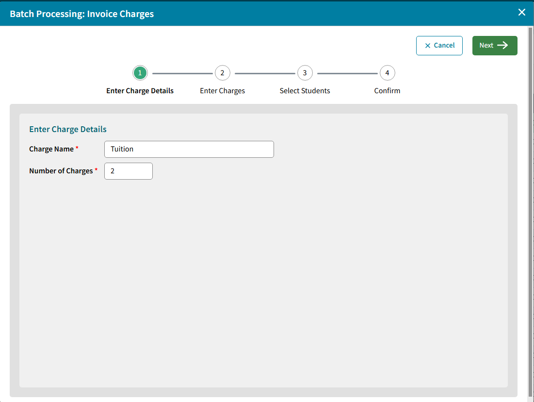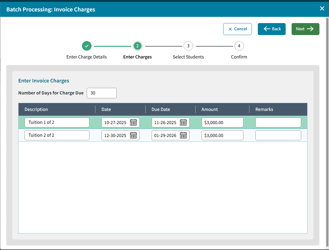 Number of Days for Charge Due can be entered so Due Date is calculated based on Date and Number. - Click Next.