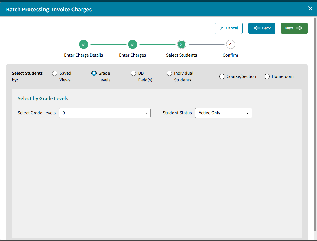 - Select Students who you want to apply the invoice charges to. Students can be selected by one of the following: