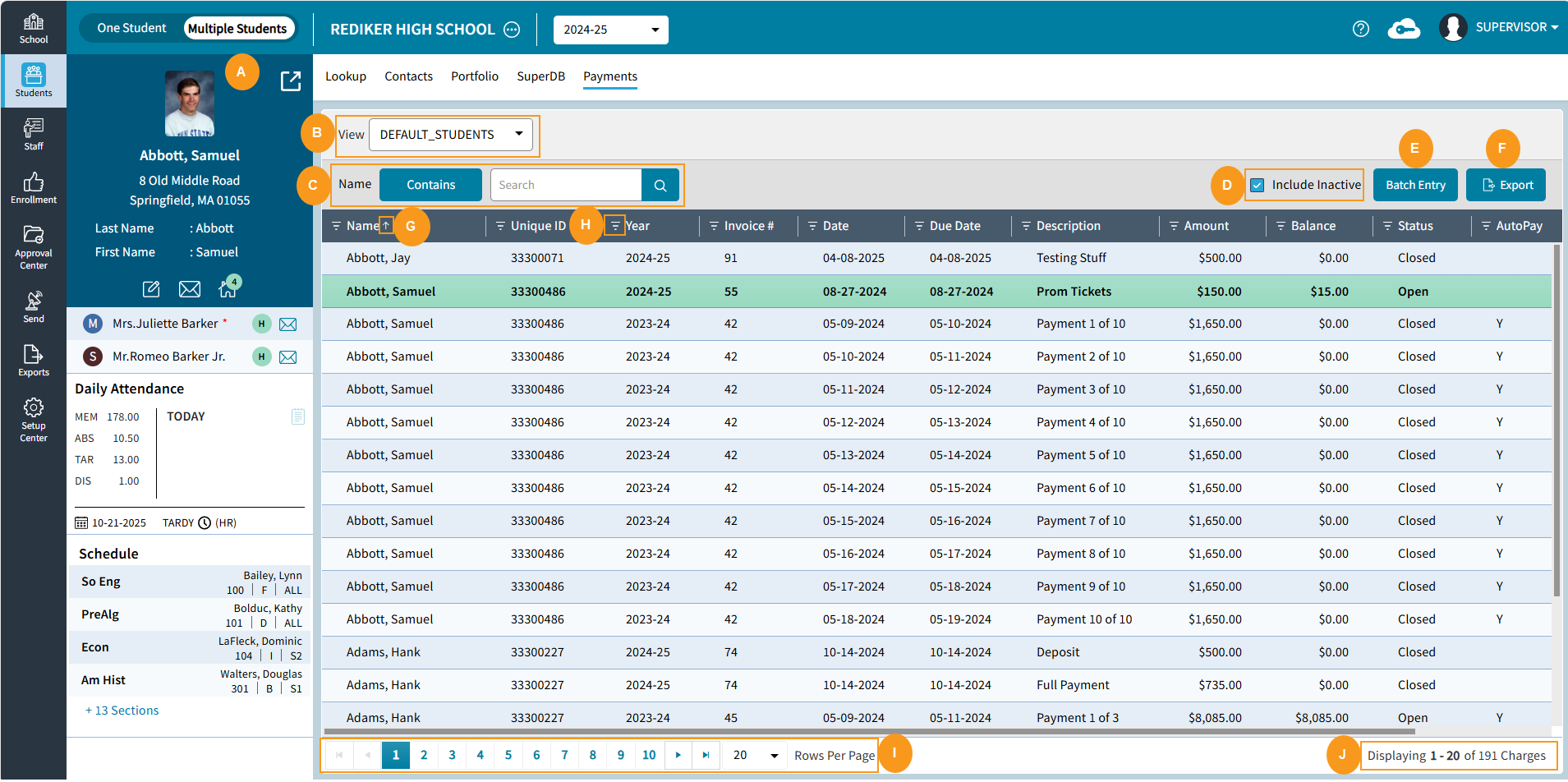 Multiple Students Payments list is constrained by the student View Selected on the Lookup tab until another view is selected. The columns in the view are fixed.