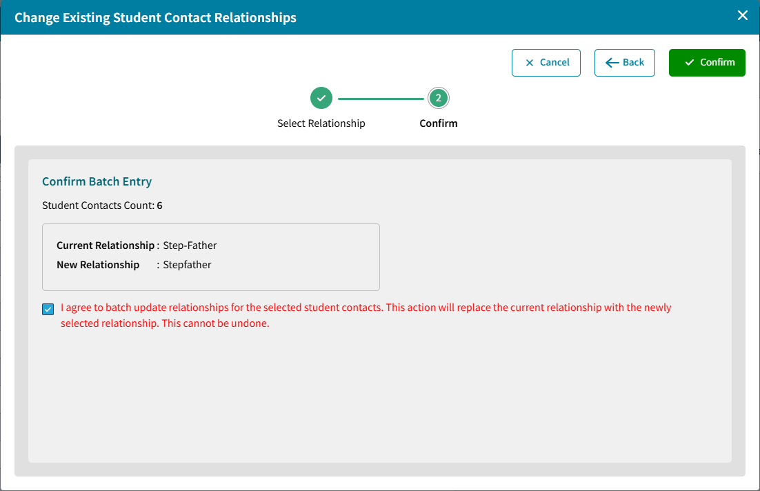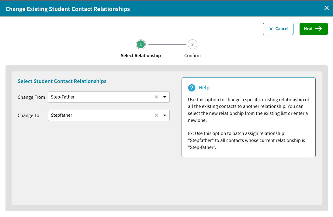 A relationship cannot be deleted until it is no longer associated with any contacts. This option is used to change a specific existing relationship of all existing contacts to another relationship. For example, change the current relationship from “Step-father” to “Stepfather”.