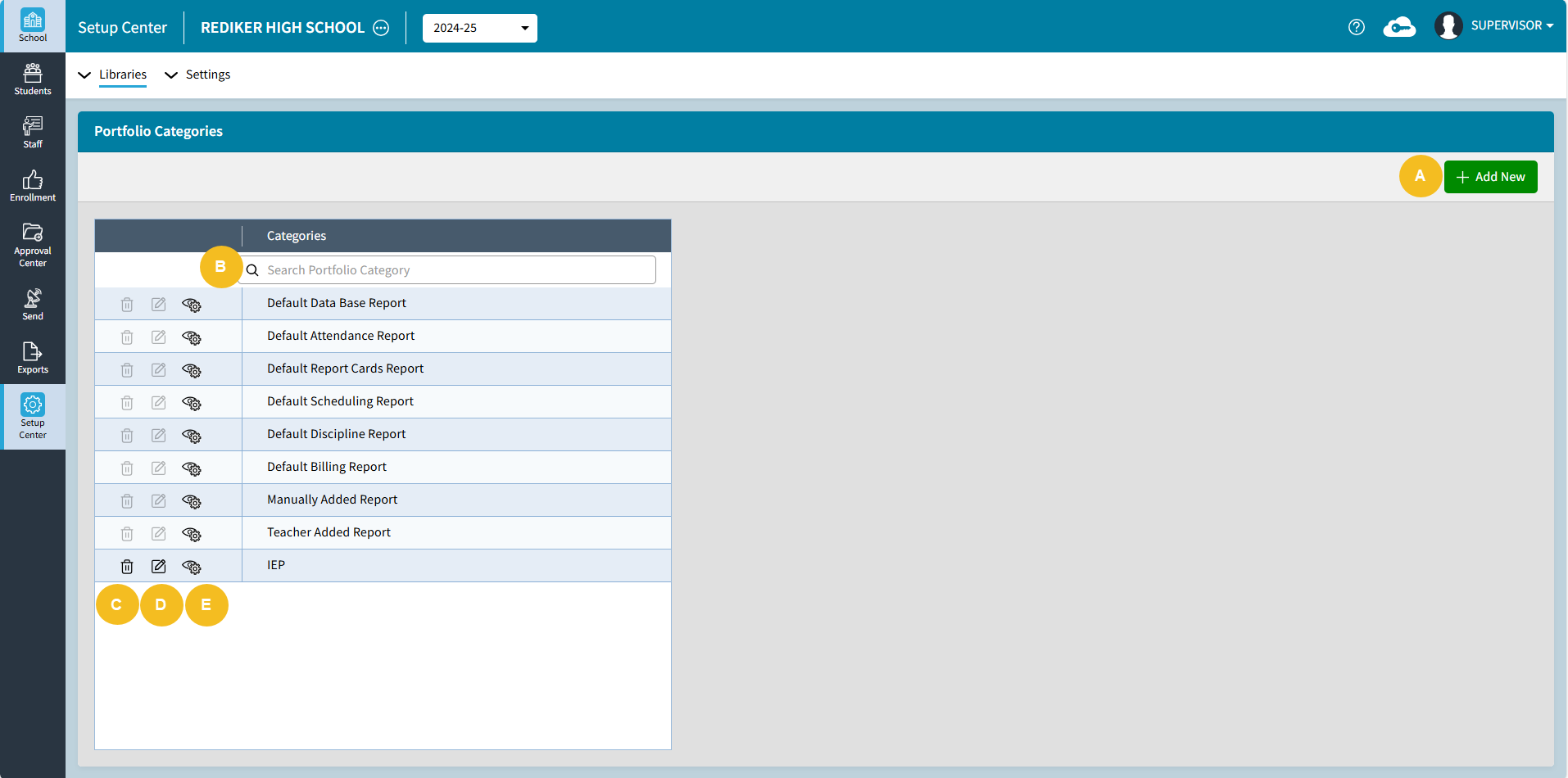 Portfolio Categories are used to manage the portfolio files saved to Student or Staff records.  There are 8 default categories that cannot be edited or deleted.  The AdminPlus Supervisor can add additional categories and can edit the Default Category Visibility settings for any Portfolio Category.