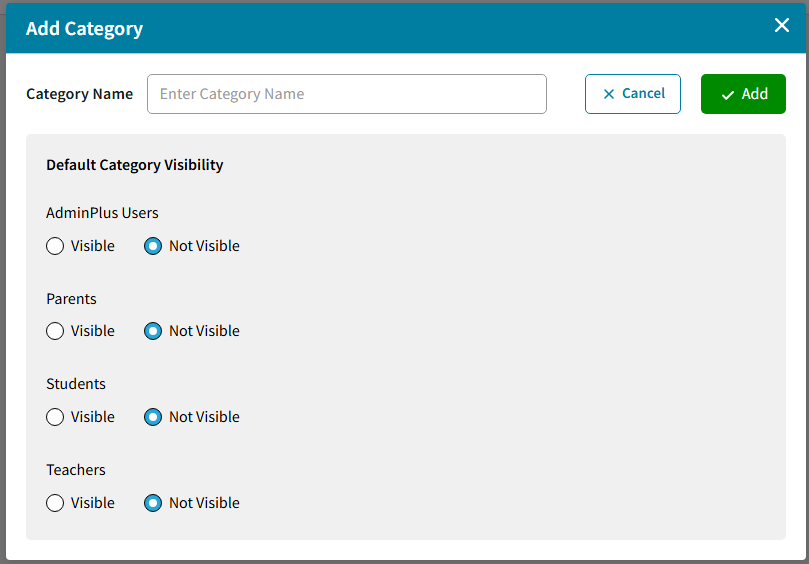 Add New - to enter a new Category Name and set Default Category Visibility