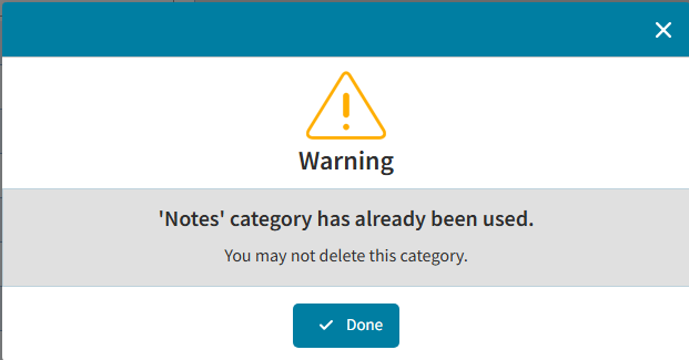 Delete If the category has not been used, a delete confirmation will pop-up to confirm deletion. A warning will display that the category has already been used so it cannot be deleted.