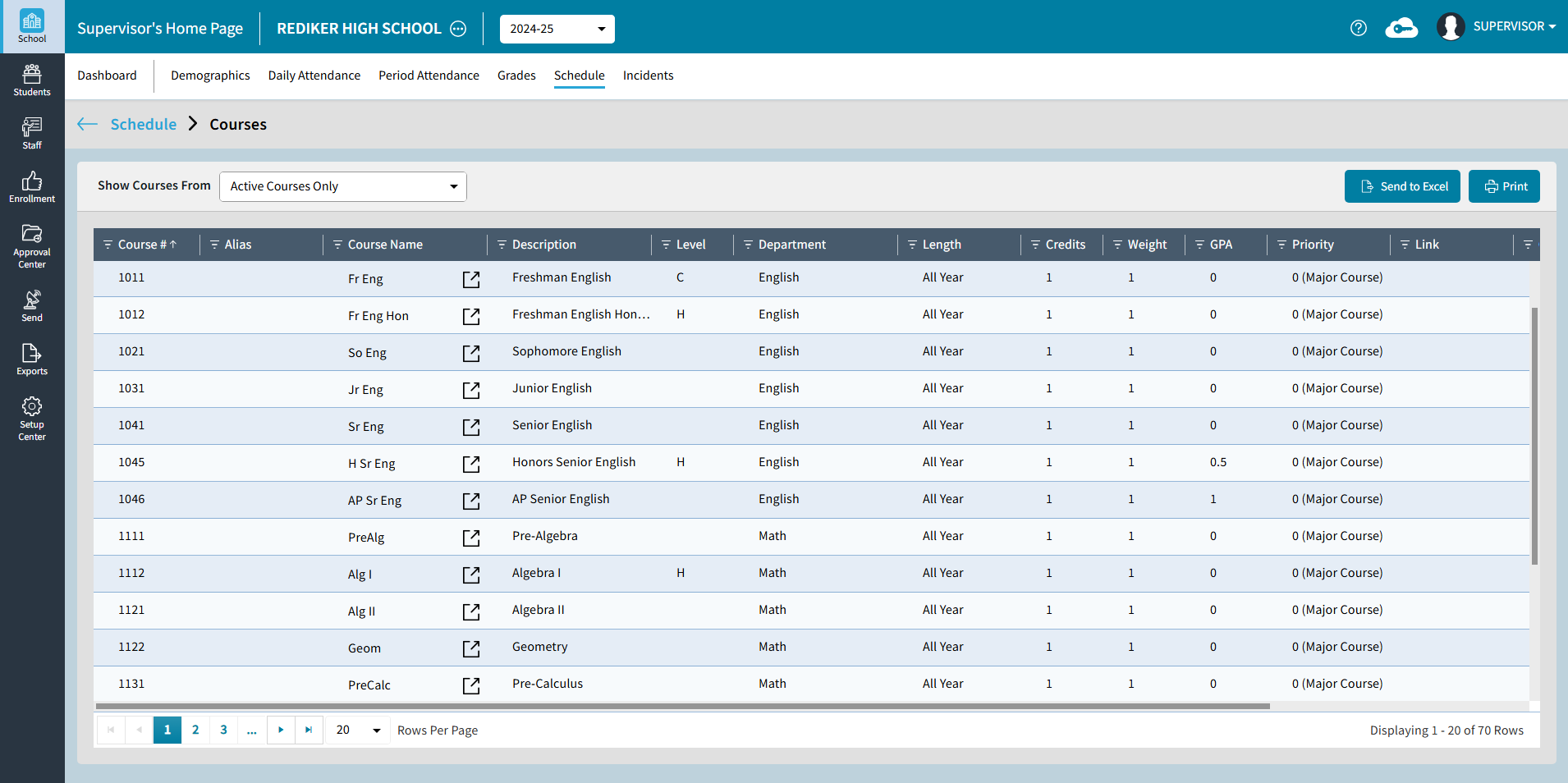 | Courses & Sections detail | Manage Courses & Sections tile counts now open a table that can be sorted or filtered. There is also a Send to Excel and Print button. | |