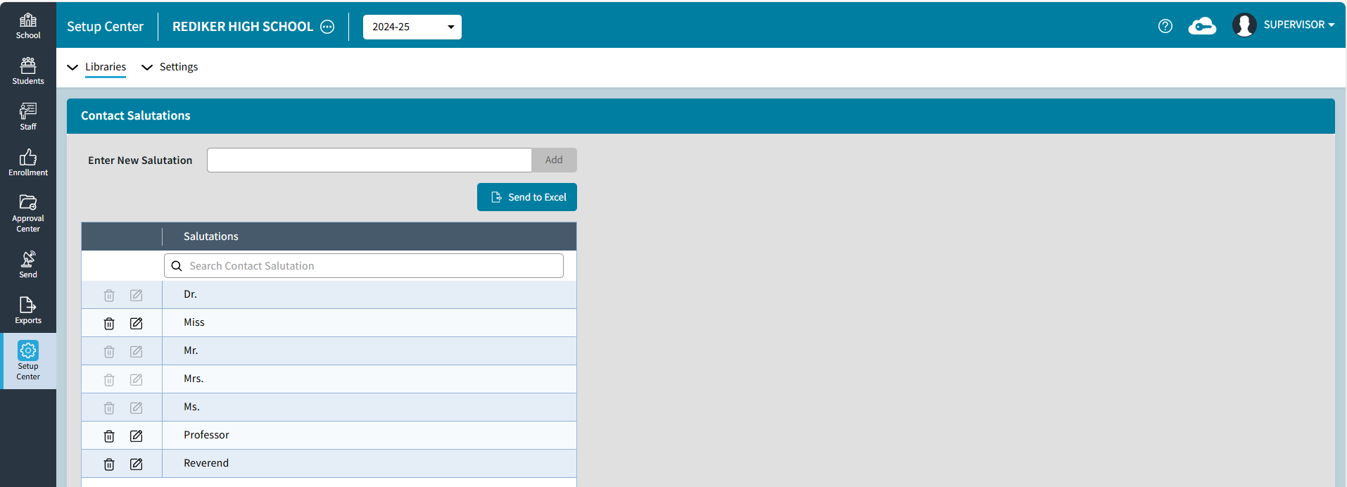 Setup Center > Libraries > Contact Salutations can be accessed by users with Contact rights. If Contact edit is set to AdminPlus.com then Salutations can be edited here instead of classic. For more information see Setup Center: Contact Salutations, Suffixes, and Relationships.