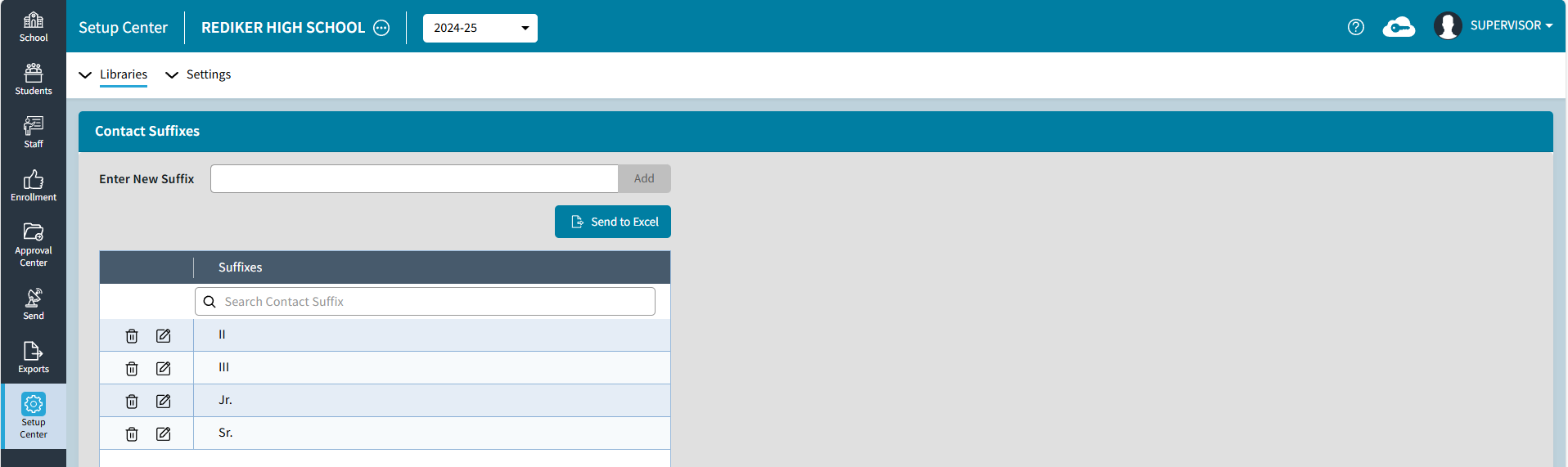 | Edit Contact Suffixes | Setup Center > Libraries > Contact Suffixes can be accessed by users with Contact rights. If Contact edit is set to AdminPlus.com then Salutations can be edited here instead of classic. | |