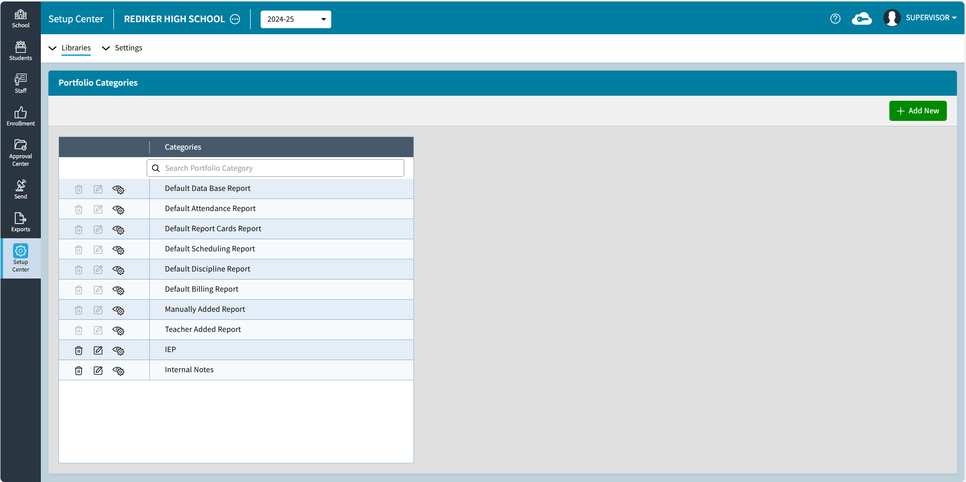 Setup Center > Libraries > Portfolio Categories can be accessed by the AdminPlus Supervisor. If Portfolio edit is set to AdminPlus.com then Portfolio categories can be edited here instead of classic. The Supervisor can also set default visibility settings for a category. For more information see Setup Center: Portfolio Categories.