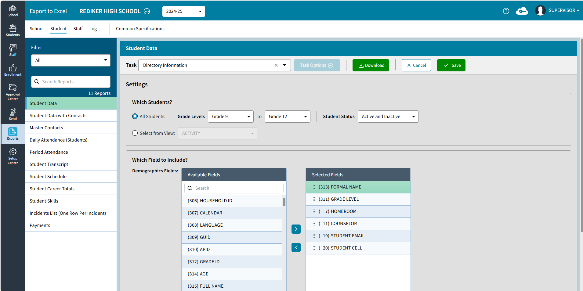 Exports > Task Options can be used to save different layouts for Student Data or Staff Data exports. The Default View contains the settings you had when the feature was added. Task Options include Save As, Rename, or Delete. The Default view cannot be renamed or deleted. Select Save As or Create New Task to select different settings. Edits will be saved when you click Download or Save.