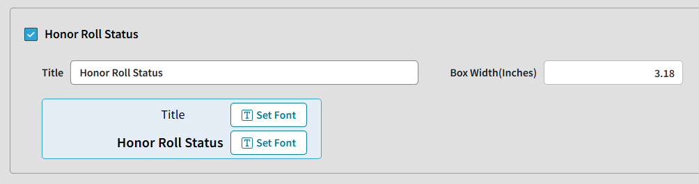 More granular settings for fonts and box widths have been added to the settings screen. For more information see School: Grade Reports Report Settings.