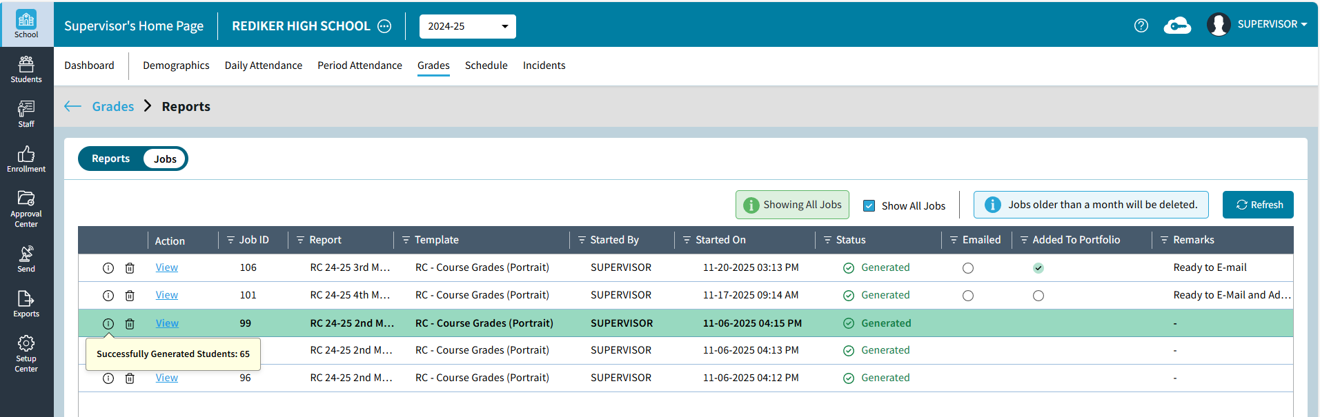 The Reports screen has been updated to toggle between Reports and Jobs. On the Jobs screen click on the information icon to see the status and number of students in the job. Click on the trash can to Delete a job that you no don't need. For more information see School: Grade Reports Jobs