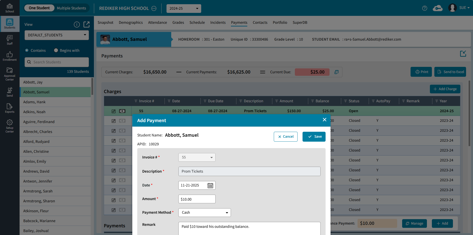 Partial payments can be recorded on the One Student Payments screen. The Charge Status will remain Open until the full amount is paid.