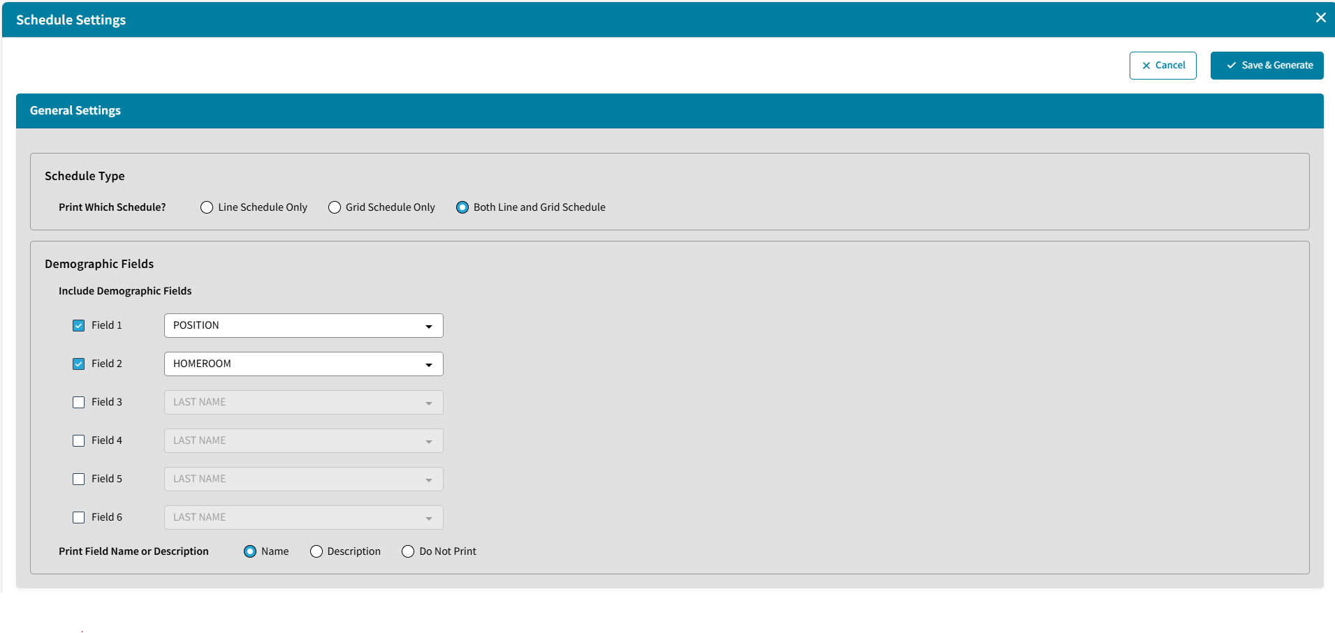 Print has the settings to Print Which Schedule and Include Demographic Fields.