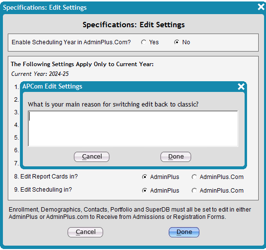 | APCom Edit Settings Change Log | Changing the edit settings from AdminPlus.com back to classic includes a prompt, "What is your main reason for switching edit back to classic?" The reason is recorded in the APCom Edit Settings Change Log. | |
