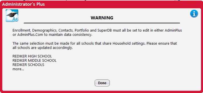 | APCom Edit Reminder | Schools in an organization that share households will get a reminder when changing the edit settings for Enrollment, Demographics, Contacts, Portfolio and SuperDB that the same selection must be made for all schools that share Household settings. | |
