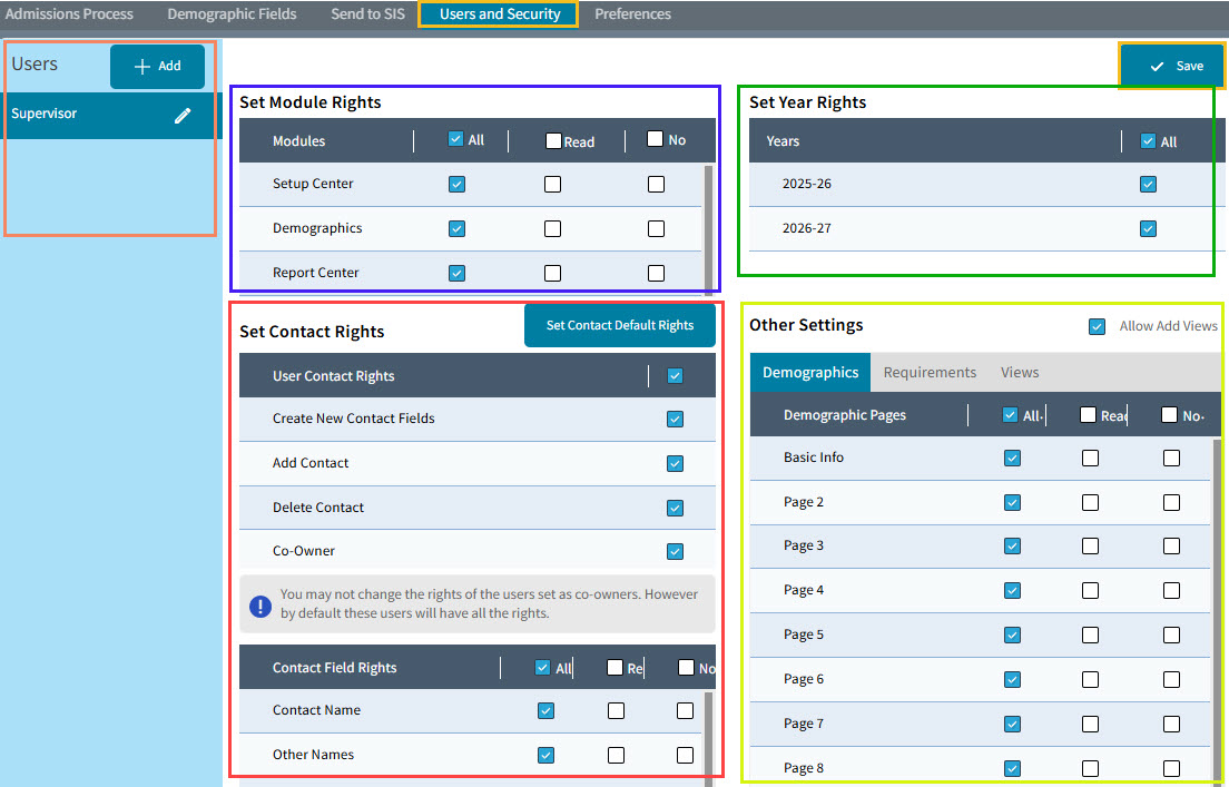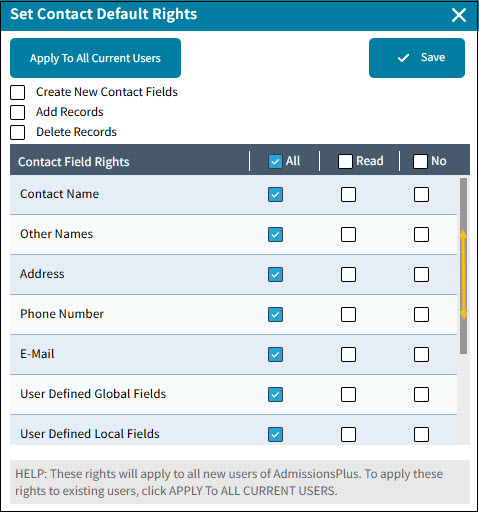 - Set Contact Default Rights: Use the Set Contact Default Rights button to set up rights that can apply to all new users added to Admissions, or to apply to existing users.