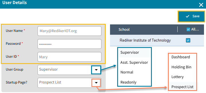 Adding Users Section (far left): To add a new Admissions User, click the Add button, and the User Details window will pop open.