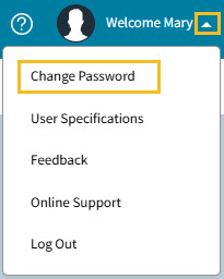The User can change their own password by clicking the down arrow in the top right next to their name and selecting Change Password.