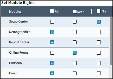 The choices are All Rights, Read Only Rights, and No Rights. Check the appropriate box for each module.