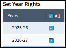 Set Year Rights Section (right top) : This section is where you set the years the user has access to.