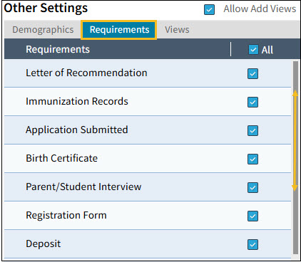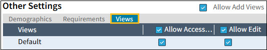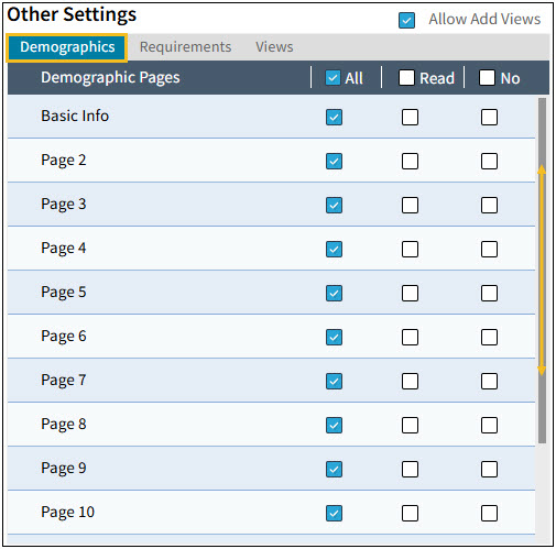Other Settings Section (right bottom) : This section is where you set the user rights to Prospect Demographic fields, Requirements and Views.