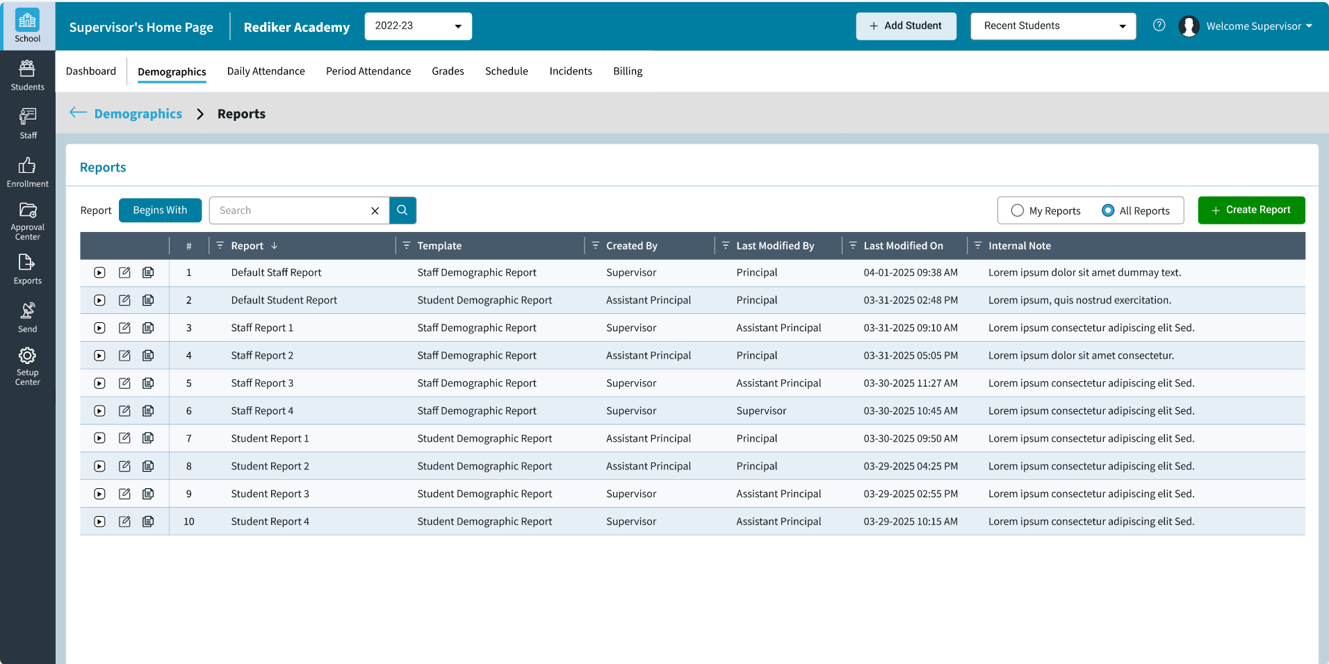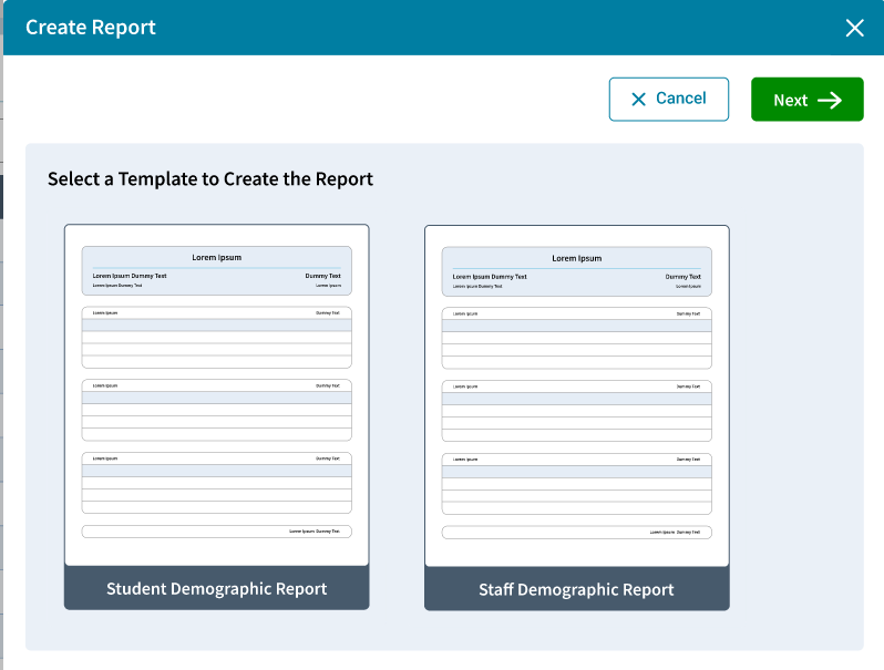 - Create Report select the Student Demographic or Staff Demographic Report Template