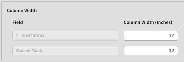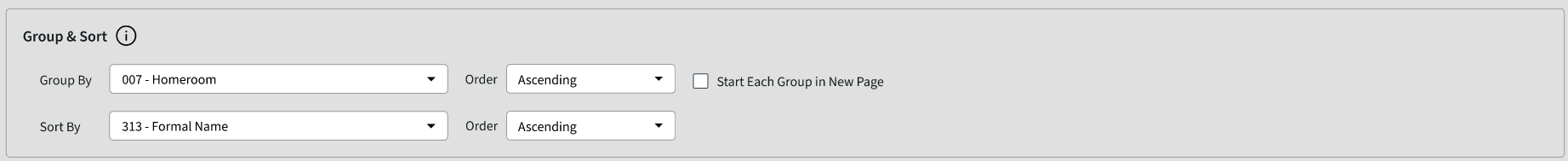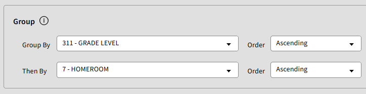 Column Width enter the width in inches. - Select the field to Group By and the field to Sort By. Click the i icon to see an example of how these settings are used in the report.