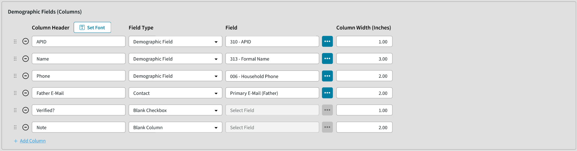 - Select the Demographic Fields (Columns), Set Font, and Column Width.
