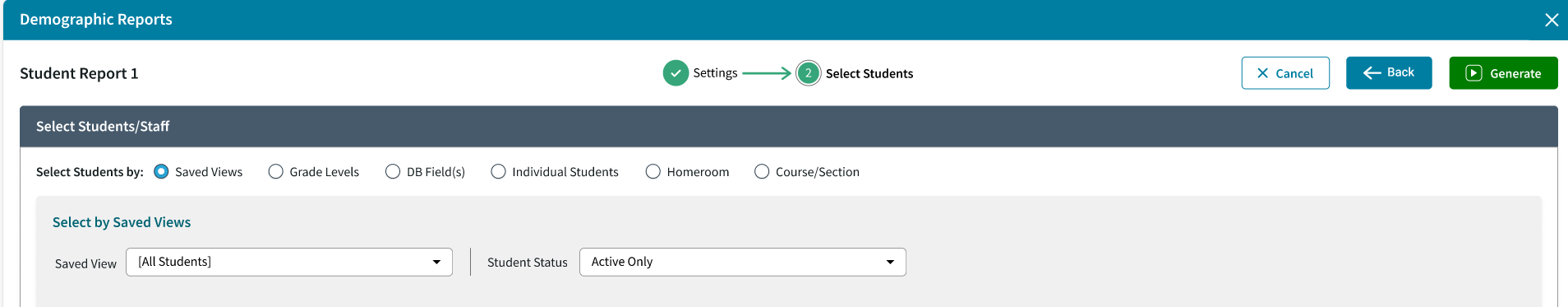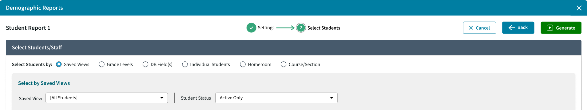 Students can be selected using Grade Level, Saved Views, DB Field(s), Individual Students, Homerooms, or Course/Section. - Select Staff for a Staff Demographic Report.