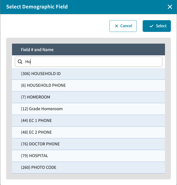 - Demographic Field -click the ellipsis next to Field to search for a demographic field by Field # or Name and Select.