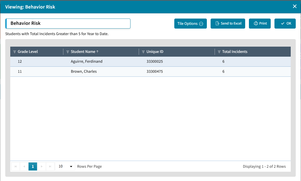 | Behavior Risk tile | A Behavior Risk tile has been added to the Dashboard Library. This Incident Search widget type is set to get the count of Students that have more than 5 incidents but can be edited for any Total Incident count. | |